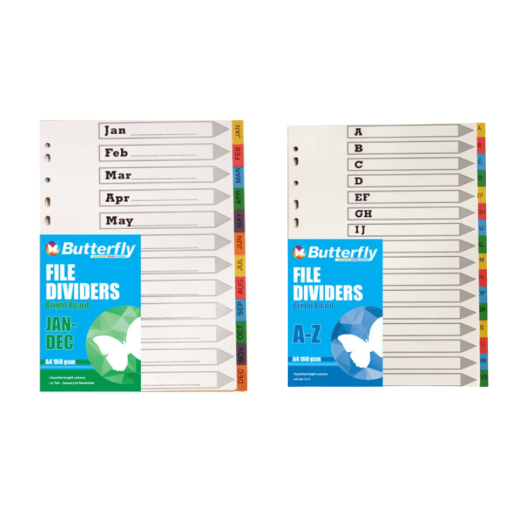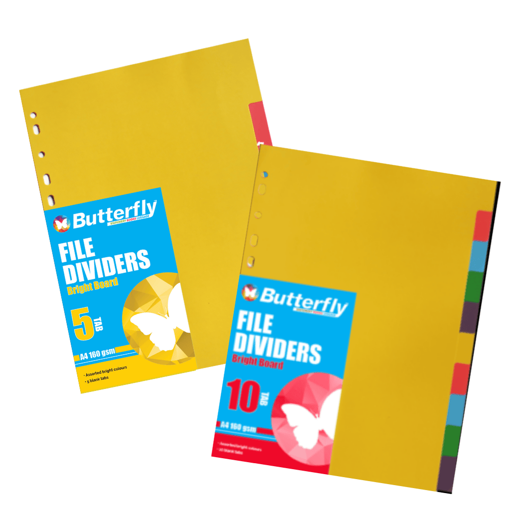 Brightly coloured A4 sized Dividers, made of sturdy manilla board.