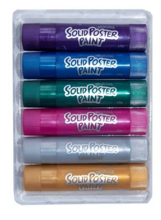 One pack with 6 different Metallic colours solid poster paint crayon sticks. Purple, blue, green, pink, silver, and gold. No water needed, bright colours, high covering power, quick drying, washable. Special for school use. For drawing and painting in a fun, easy and clean way. for painting on paper, cardboard, wood etc. Instant application with no need for water. Saves Time. Very practical and clean. Silky finish. Protective glaze not necessary. Solvent Free. Easy to use: Uncap, rotate the base to make the stick come out and draw.