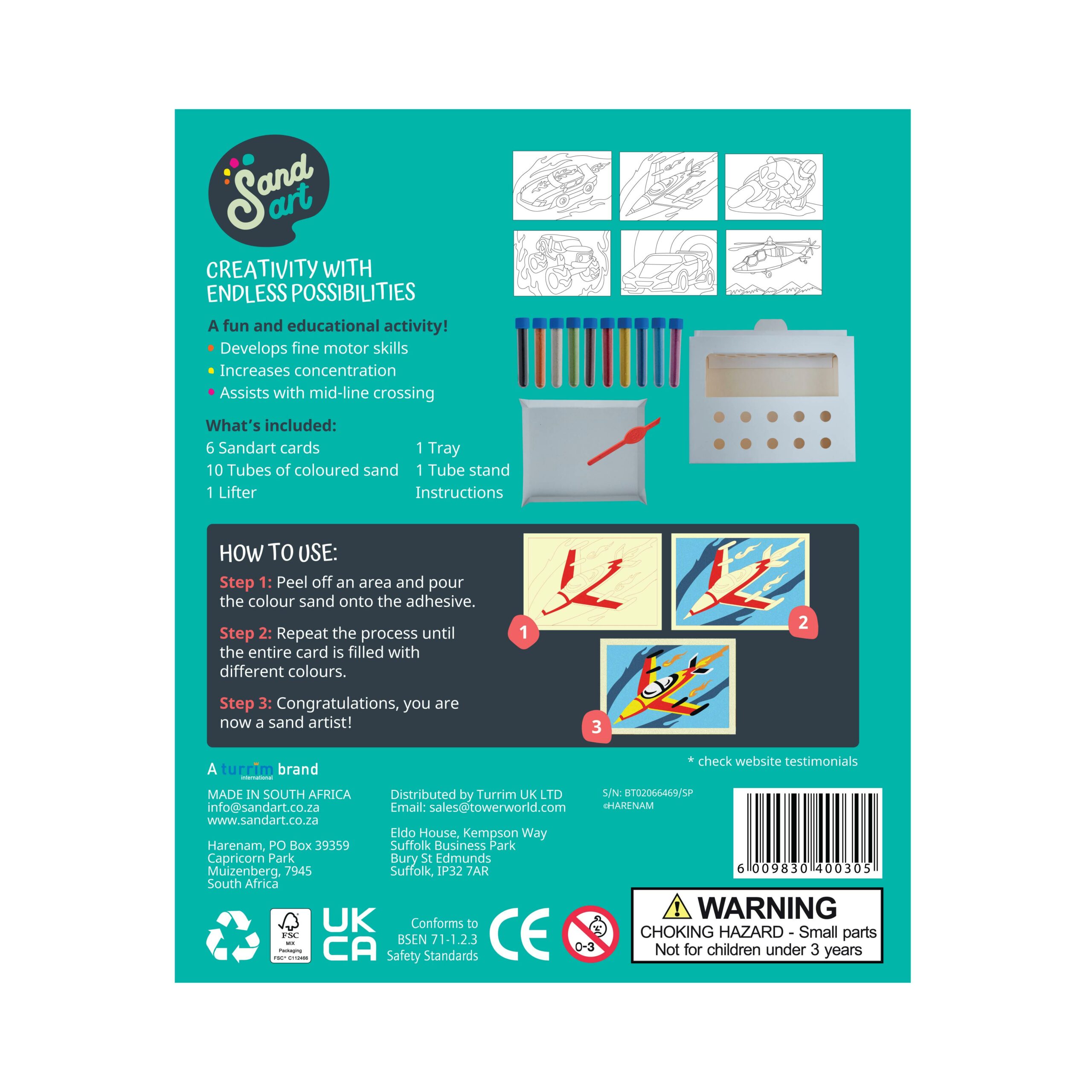 The kit comes with ten sand bottles and 6 card designs featuring a variety of thrilling transportation options, making it an excellent choice for kids who love speedy cars, motorbikes, helicopters and monster trucks.